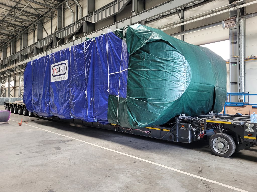Skraplacz powstał w zakładach Famet S.A. w Opolu. To potężne urządzenie zostanie przetransportowane w postaci dwóch ważących po 73 tony modułów – długich na 14 metrów i wysokich na niemal 6 metrów. Pierwsza część skraplacza dotarła już na miejsce po pokonaniu ponad 600-kilometrowej trasy. Transport drugiego modułu rozpocznie się jeszcze we wrześniu br.