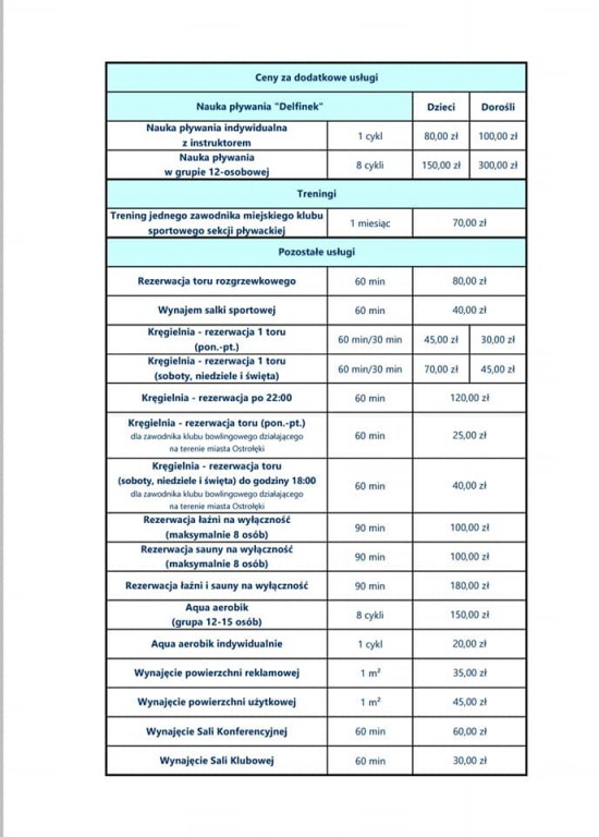 Ceny za usługi oferowane przez Park Wodny Aquarium obowiązujące od 1 sierpnia 2022:
