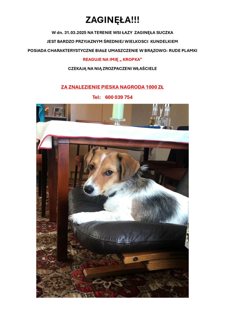 Zrozpaczeni właściciele proszą o pomoc w odnalezieniu ukochanej suczki o imieniu Kropka, która zaginęła 31 marca 2025 roku na terenie wsi Łazy. Piesek jest średniej wielkości kundelkiem o bardzo przyjaznym usposobieniu.