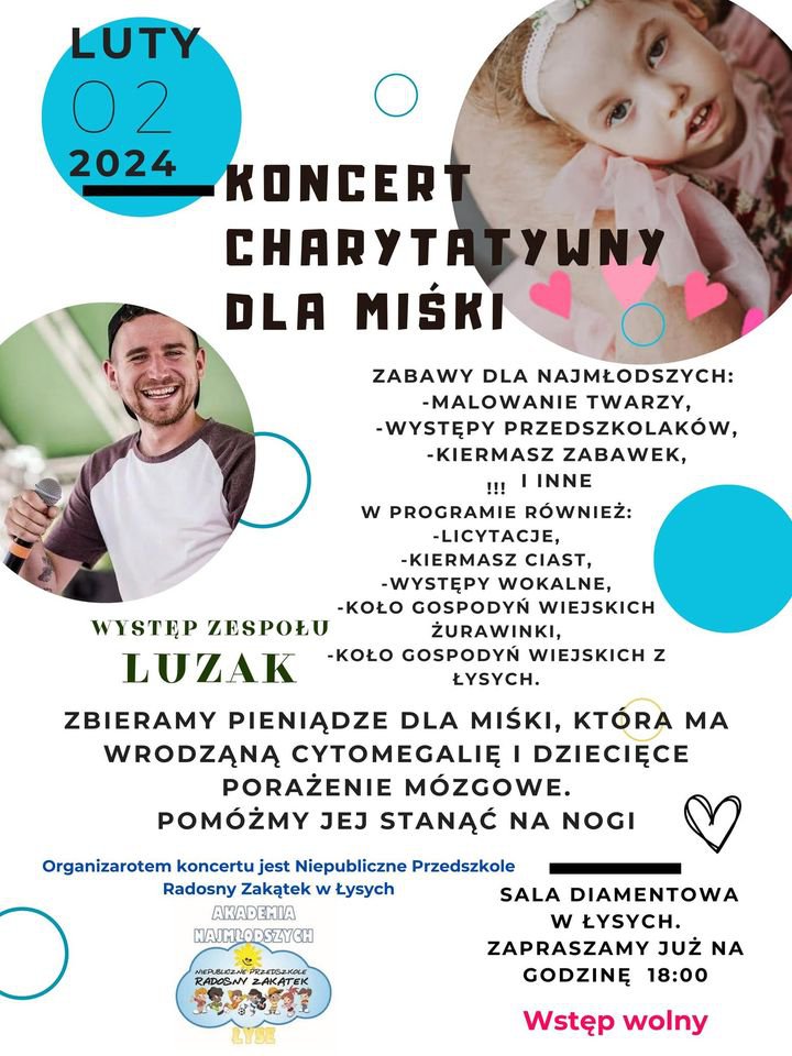Niepubliczne Przedszkole Radosny Zakątek w Łysych zaprasza na koncert charytatywny. Podczas koncertu będą zbierane pieniądze dla Michaliny Malinowskiej. Dziewczynka urodziła się z cytomegalią wrodzona oraz mózgowym porażeniem dziecięcym.