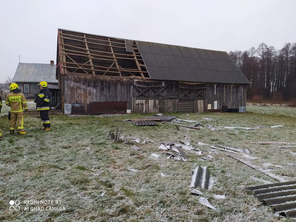 Ok. godz.  9:00 silny wiatr zerwał dach z budynku gospodarczego w miejscowości Aleksandrowo (powiat ostrołęcki). Na miejscu pojawili się strażacy z OSP KSRG Troszyn, OSP Dzbenin.