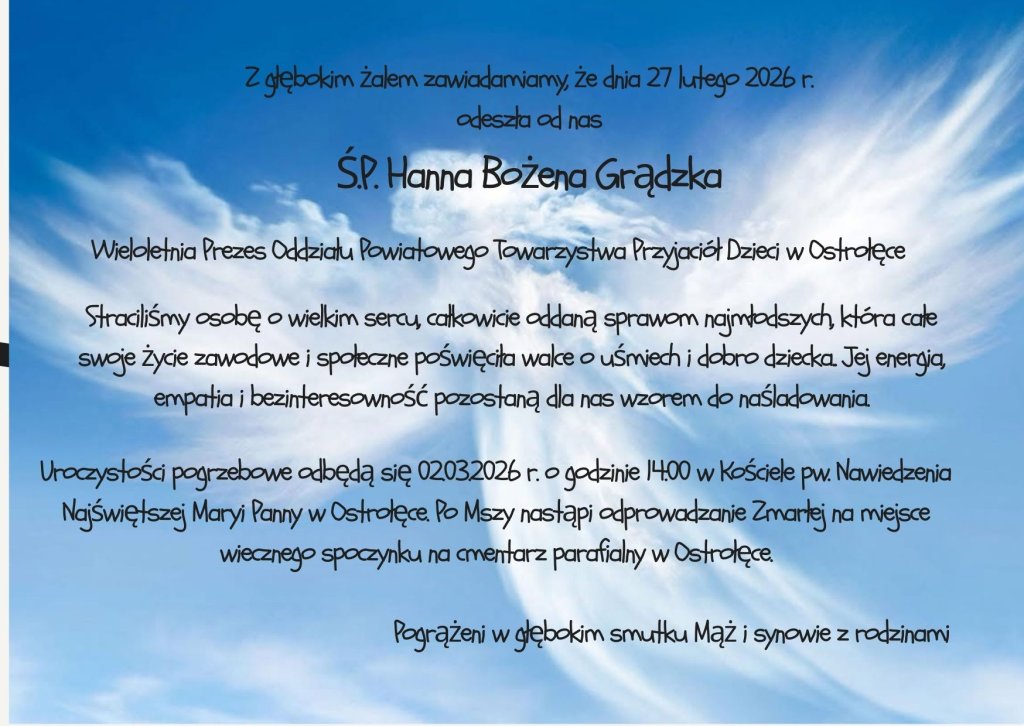 Uroczystości pogrzebowe śp. Hanny Grądzkiej odbędą się 2 marca 2026 r. w kościele farnym oraz na cmentarzu parafialnym. Szczegóły tutaj.