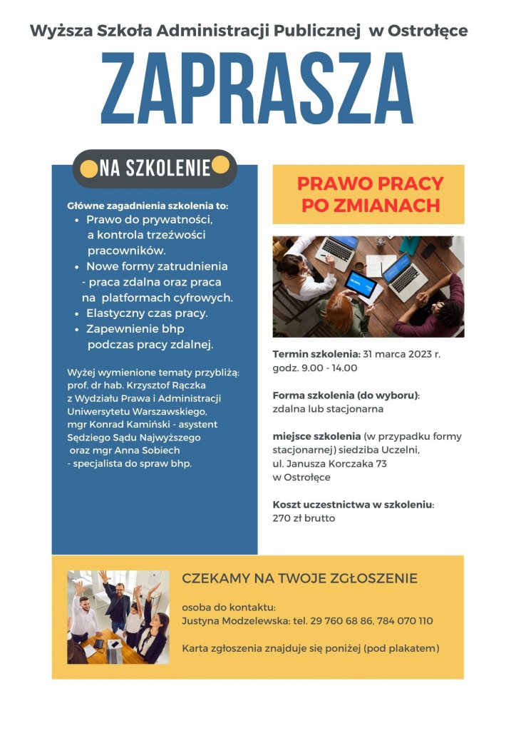 Wyższa Szkoła Administracji Publicznej w Ostrołęce zaprasza na szkolenie pt. „Prawo pracy po zmianach” organizowane w dniu 31 marca 2023 r. o godz. 10.00.