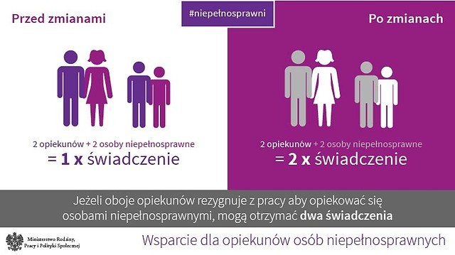 Obecnie osoby opiekujące się więcej niż jedną osobą niepełnosprawną w rodzinie mogą otrzymać wyłącznie jedno świadczenie opiekuńcze (świadczenie pielęgnacyjne – 1300 zł, specjalny zasiłek opiekuńczy – 520 zł, zasiłek dla opiekuna – 520 zł), nawet jeśli oboje musieli zrezygnować z pracy. Po zmianach każdy z nich będzie mógł otrzymać świadczenie, gdy zrezygnuje z pracy (lub jej nie podejmie).