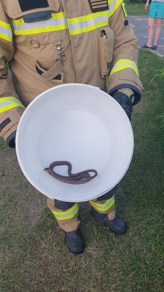W miejscu wskazanym przez zgłaszającą strażacy znaleźli dużych rozmiarów okaz węża. Był to niejadowity gniewosz plamisty. Gad został złapany i następnie wypuszczony w głąb lasu.
